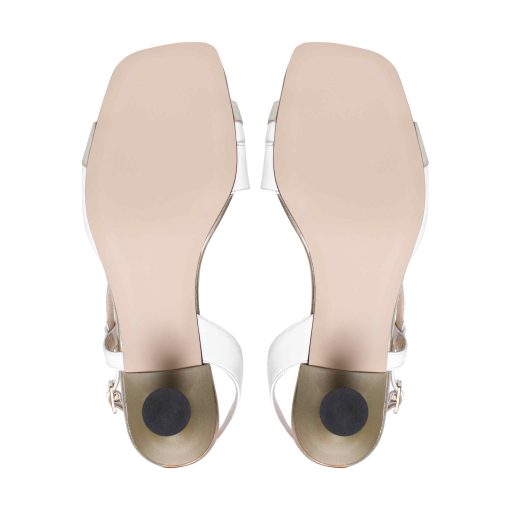 Вишукані жіночі відкриті босоніжкі на підборах 7 см. Виготовлені з м’якоі шкіри у поєднанні білого та золотого кольорів. Комфортна колодка, стійкий підбор та поєднання базових кольорів робить босоніжки підходящими, як для щоденного використання так і гарно доповнять будь-який святковий образ