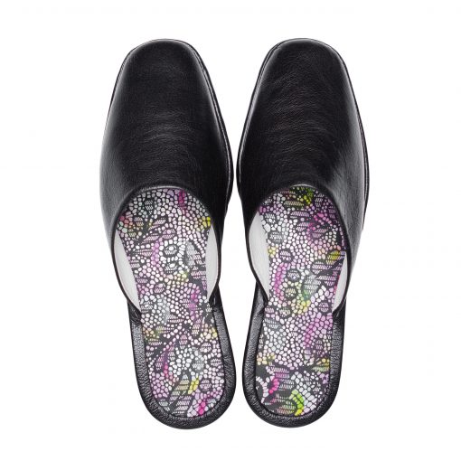 Вишукані домашні капці на зручній та стійкій танкетці. Виконані в класичній шкірі чорного кольору. Яскравим акцентом є різнокольорова підкладка. В данній моделі підібрана оптимальна висота танкетки, в якій ногам зручно протягом всього дня, в той самий час вона робить капці більш вишуканими та їх можна носить навіть на роботі. Для більшої практичності підошву зробили з EVA, завдяки якій Ви зможете війти навіть на відкриту терасу.