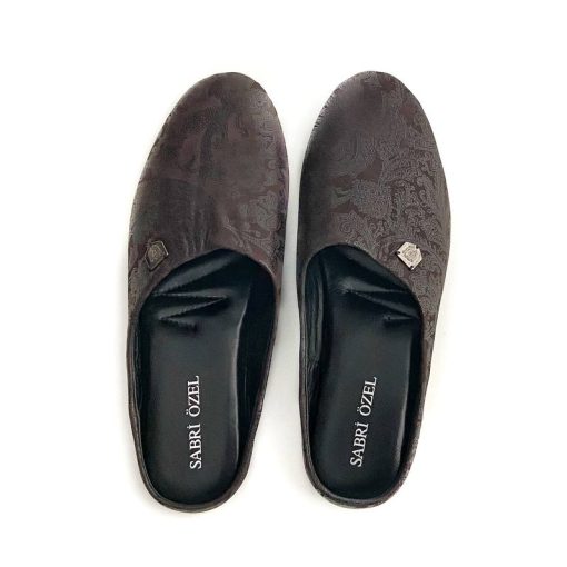 Паркетні капці темного кольору з бароковим візерунком і чорною устілкою – доказ того, що домашнє взуття може бути не тільки комфортним, але і ефектним. Капці вийшли особливо м’якими за рахунок конструкції і матеріалу. Модель виконали повністю з м’якої натуральної шкіри, яка комфортно облягає стопу. Модель підходить для більш вузької стопи.