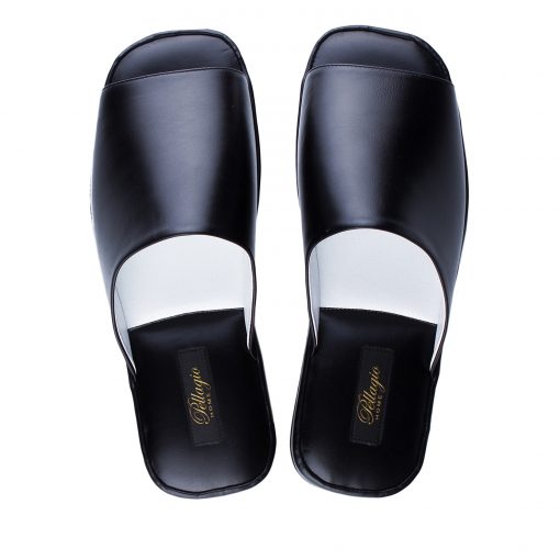 Класична модель відкритих чоловічих капців чорного кольору з м’якої і еластичної шкіри виконали з усією увагою до комфорту. Легка і безшумна підошва з EVA дозволить вийти в капцях навіть на відкриту терасу. Малюнок підошви може змінюватись!