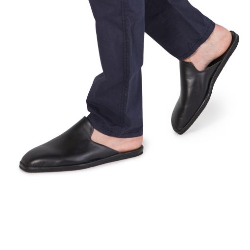 Домашні капці з фігурним вирізом, як у сліперів, зшиті з щільної і еластичної шкіри чорного кольору. Всередині вони оброблені приємною на дотик, м’якою гладкою шкірою. Анатомічно правильна колодка робить дані капці дуже комфортними, а легка підошва з EVA робить їх практичними. Малюнок підошви може змінюватись!