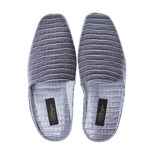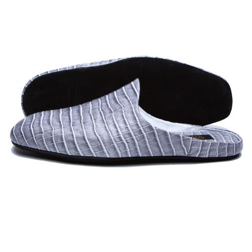 Паркетні капці з міцною сірої шкіри з імітацією шкіри крокодила. Анатомічно правильна колодка робить ці капці дуже зручними.