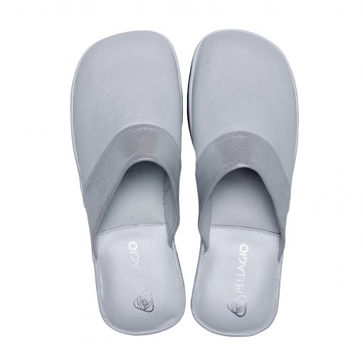 Класична модель закритих жіночих капців з м’якої білої шкіри з перламутровим манжетом. Легка і безшумна підошва з EVA дозволить вийти в капцях навіть на відкриту терасу.