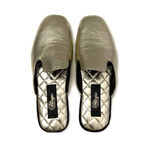 Домашні мюлі, зроблені з натуральної шкіри золотого кольору. Особливу увагу привертає прострочена устілка. Легкі і практичні, дуже зручно брати такі капці з собою в будь-які подорожі.