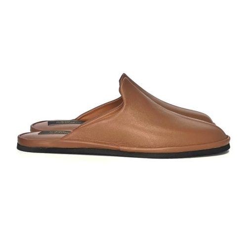Класична модель закритих жіночих капців з гладкої бежевої шкіри. Дана модель капців має фігурну союзку, завдяки якій впевненно тримається на стопі. Легка і безшумна підошва з EVA дозволить вийти в капцях навіть на відкриту терасу.