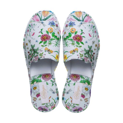 Класична модель відкритих жіночих капців з м’якої білої шкіри з квітковим принтом. Дана модель капців має фігурну союзку, завдяки якій впевненно тримається на стопі. Легка і безшумна підошва з EVA дозволить вийти в капцях навіть на відкриту терасу.