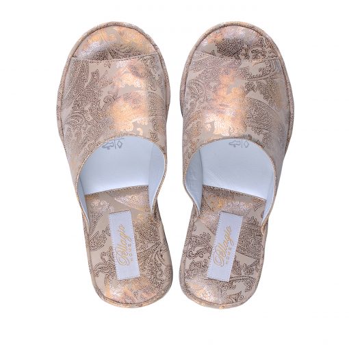 Вишукані капці з відкритим носком пісочного кольору з золотистим бароковим візерунком. Завдяки правильній конструкції союзки капці практично не відчуваються на нозі, але при цьому надійно тримаються на ній. Легка і безшумна підошва з EVA дозволить вийти в капцях навіть на відкриту терасу. Малюнок підошви може змінюватись!