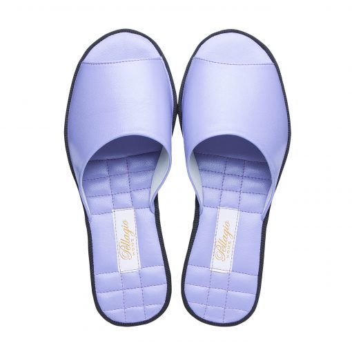 Відкриті капці насиченого ніжно-бузкового кольору виконані в м’якій шкірі-шевро. Завдяки правильній конструкції союзки капці практично не відчуваються на нозі, але при цьому надійно тримаються на ній. Оригінальним акцентом моделі є стильно прострочена устілка. Легка і безшумна підошва з EVA дозволить вийти в капцях навіть на відкриту терасу.