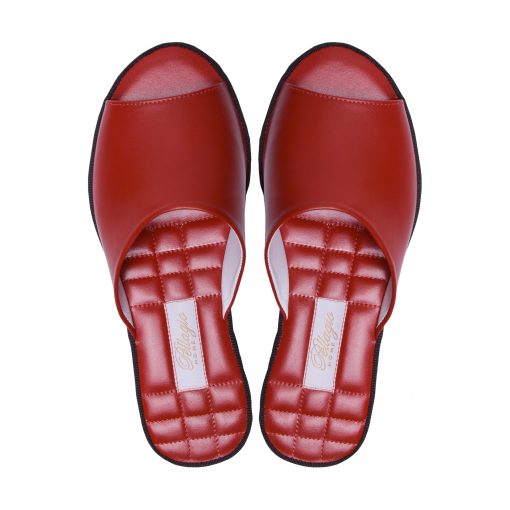 Відкриті капці насиченого червоного кольору виконані в гладкій шкірі. Завдяки правильній конструкції союзки капці практично не відчуваються на нозі, але при цьому надійно тримаються на ній. Оригінальним акцентом моделі є стильно прострочена устілка. Легка і безшумна підошва з EVA дозволить вийти в капцях навіть на відкриту терасу.