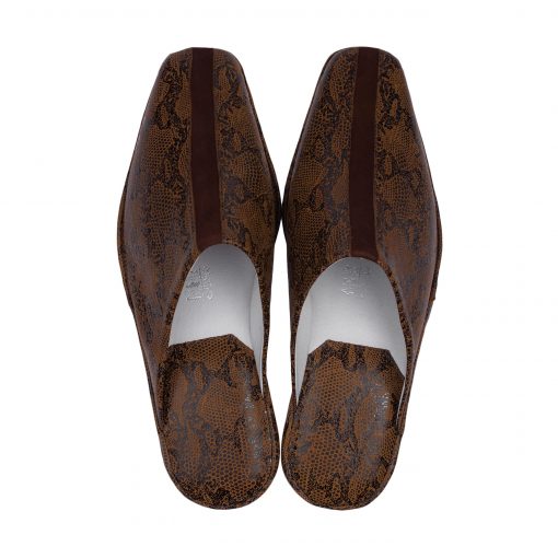 Закриті елегантні чоловічі капці коричневого кольору, виконані з міцної та еластичної шкіри з імітацією шкіри змії, легка і безшумна підошва з EVA робить їх дуже практичними. УВАГА! На вузьку стопу можна брати на розмір менше. На широку – розмір в розмір.